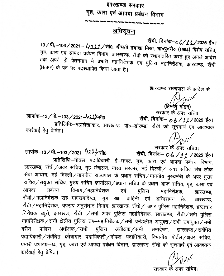 “श्रीमती तदाशा मिश्रा, 1994 बैच की आईपीएस अधिकारी एवं विशेष सचिव, गृह, कारा एवं आपदा प्रबंधन विभाग, झारखंड, रांची को स्थानांतरण करते हुए उनके ही वेतनमान में प्रभारी महानिदेशक एवं पुलिस महानिदेशक, झारखंड के पद पर पदस्थापित किया जाता है।”